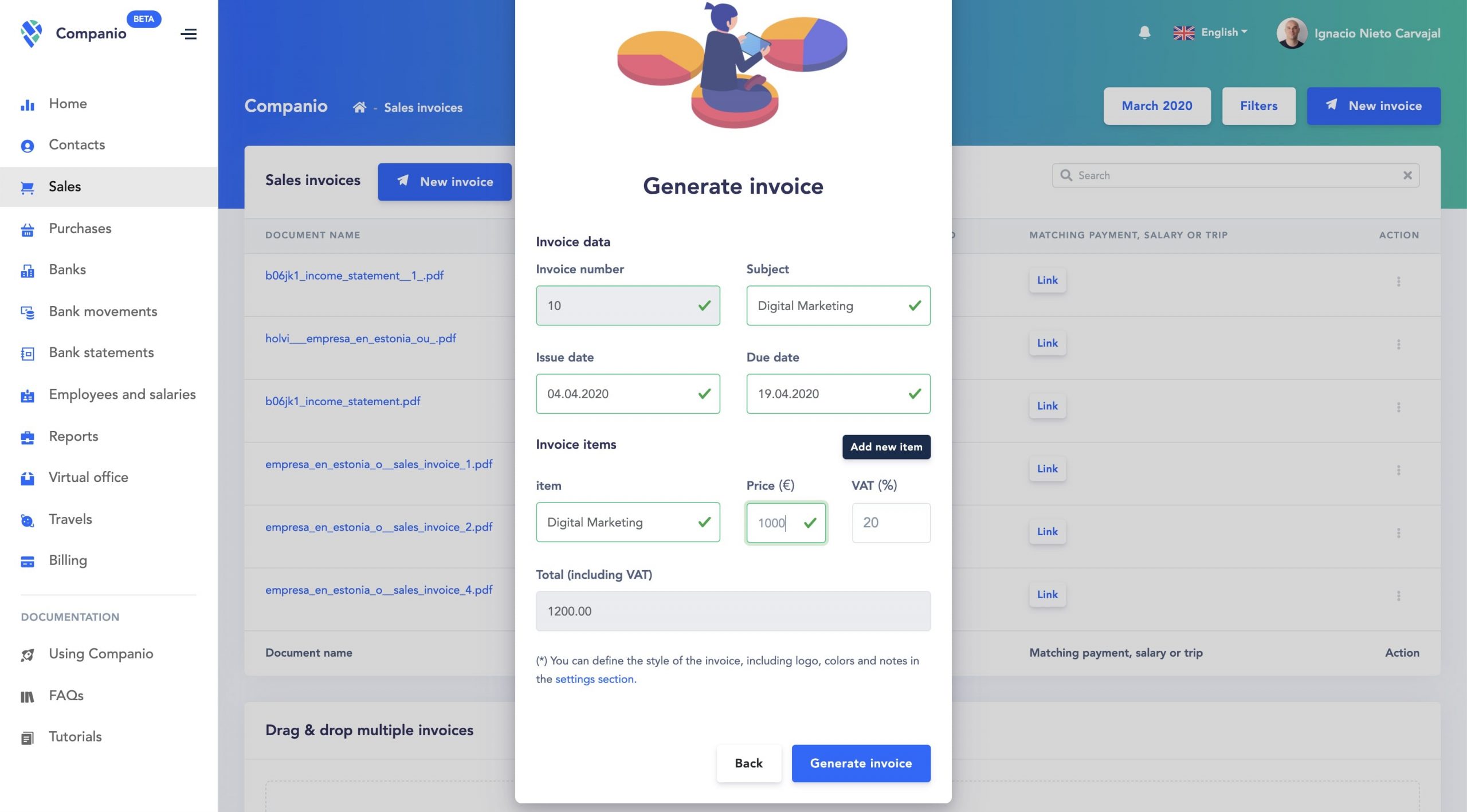 Then there is also an invoicing tool that allows you to easily generate and send an invoice to any of these contacts. You simply enter the concept of the invoice, the appropriate fees, applicable VAT, and voila! Companio will assign a unique invoice number, generate a PDF, and add it to your sales invoices automatically. If you are satisfied with this invoice, you can send it to the customer via email with a single click.