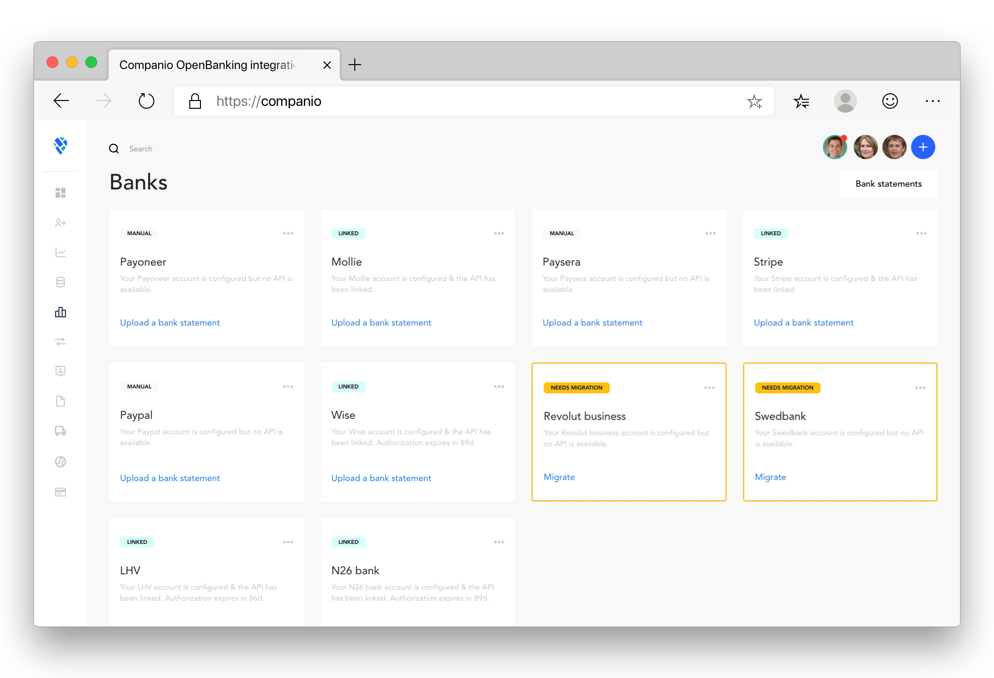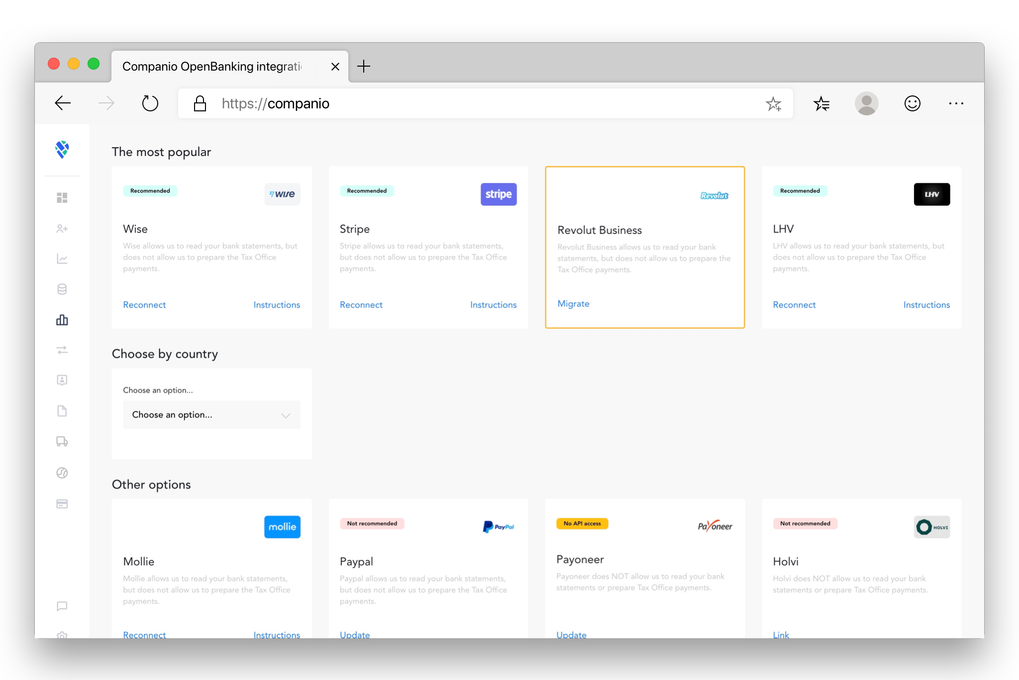 We will have to ask you to reconnect some of your bank accounts. If you have a Wise (prev. Transferwise), Revolut Business, LHV, SEB, or Swedbank account, please access Companio and reconnect them to the new system.
