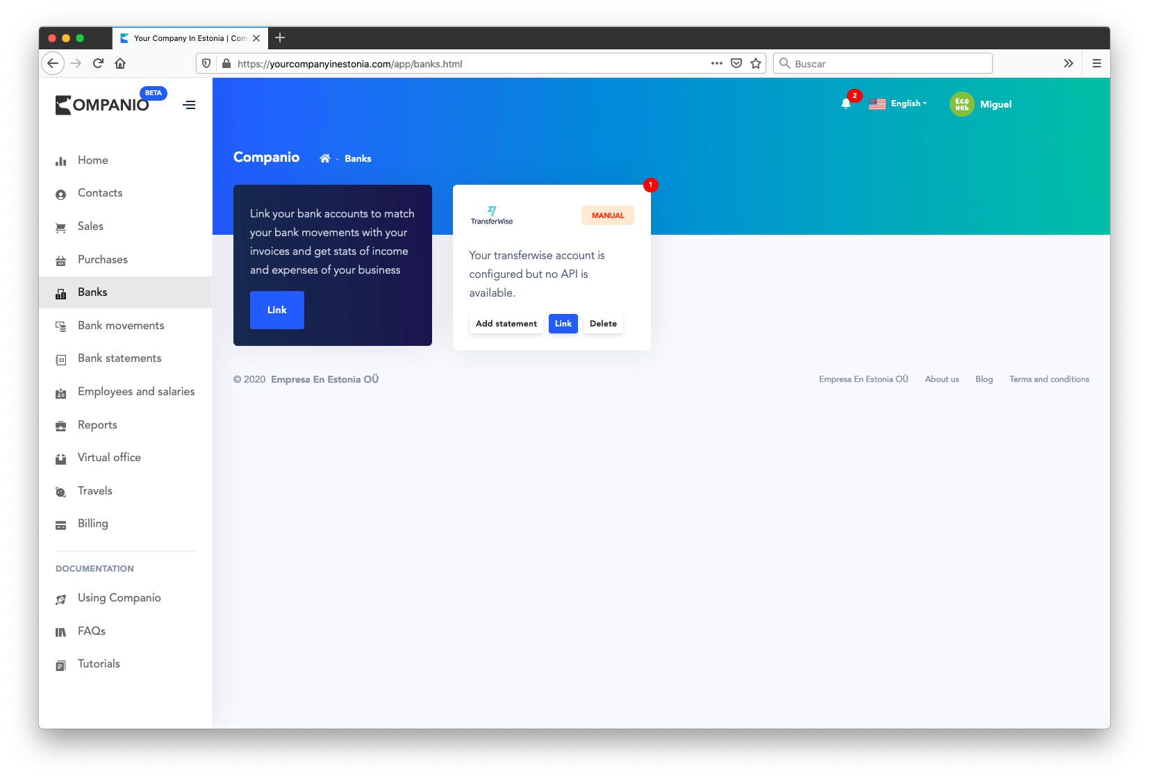If you had connected your Wise bank account previously using the API key, you will need to reconnect it again. In that case, upon accessing Companio, so you will see a screen similar to this:
