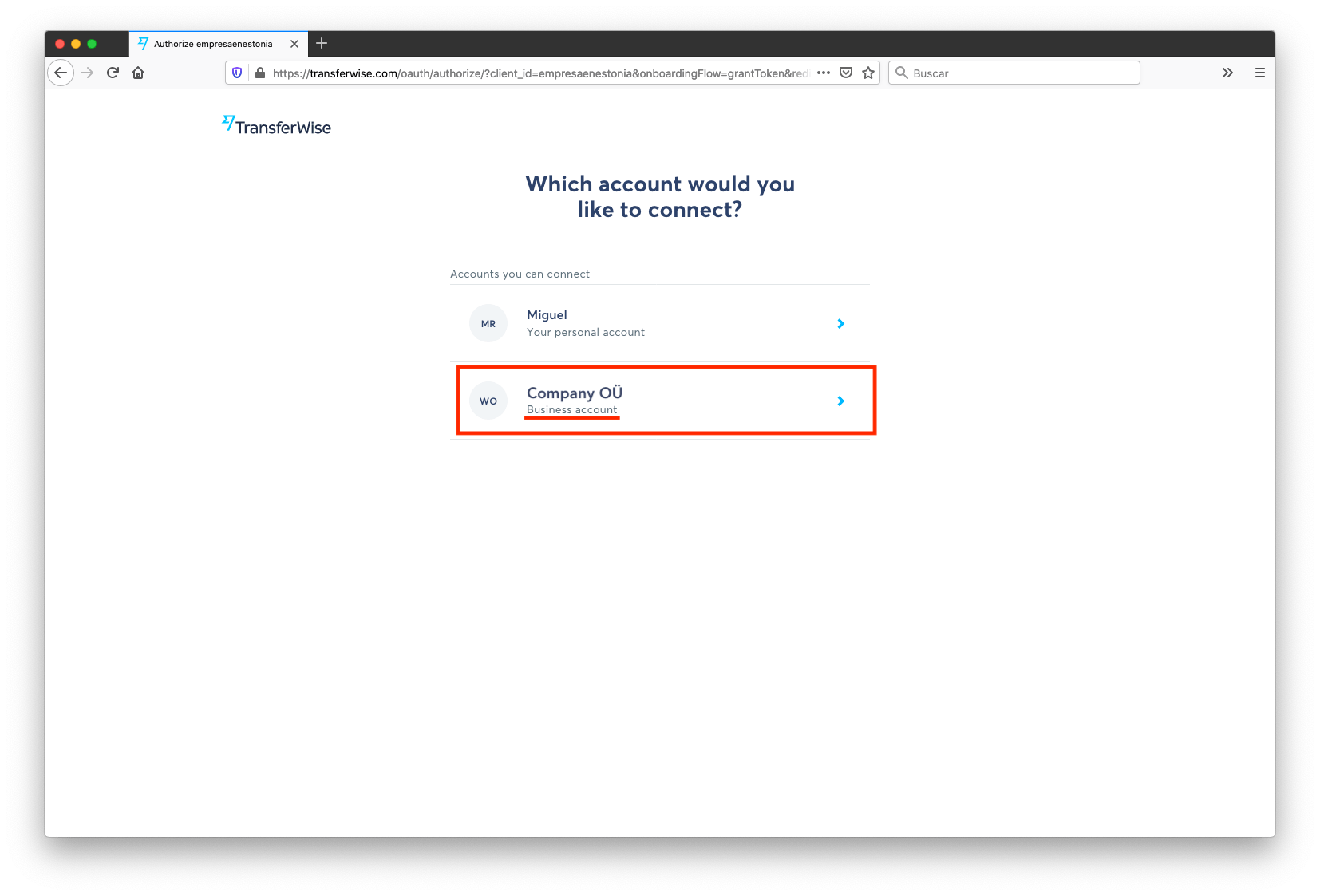 You will be asked which account you want to link with Companio. As you may know, Wise gives you a personal and a corporate account. It is important that you choose the account of your company (the one ending in OÜ) and NOT your personal account (under your name).