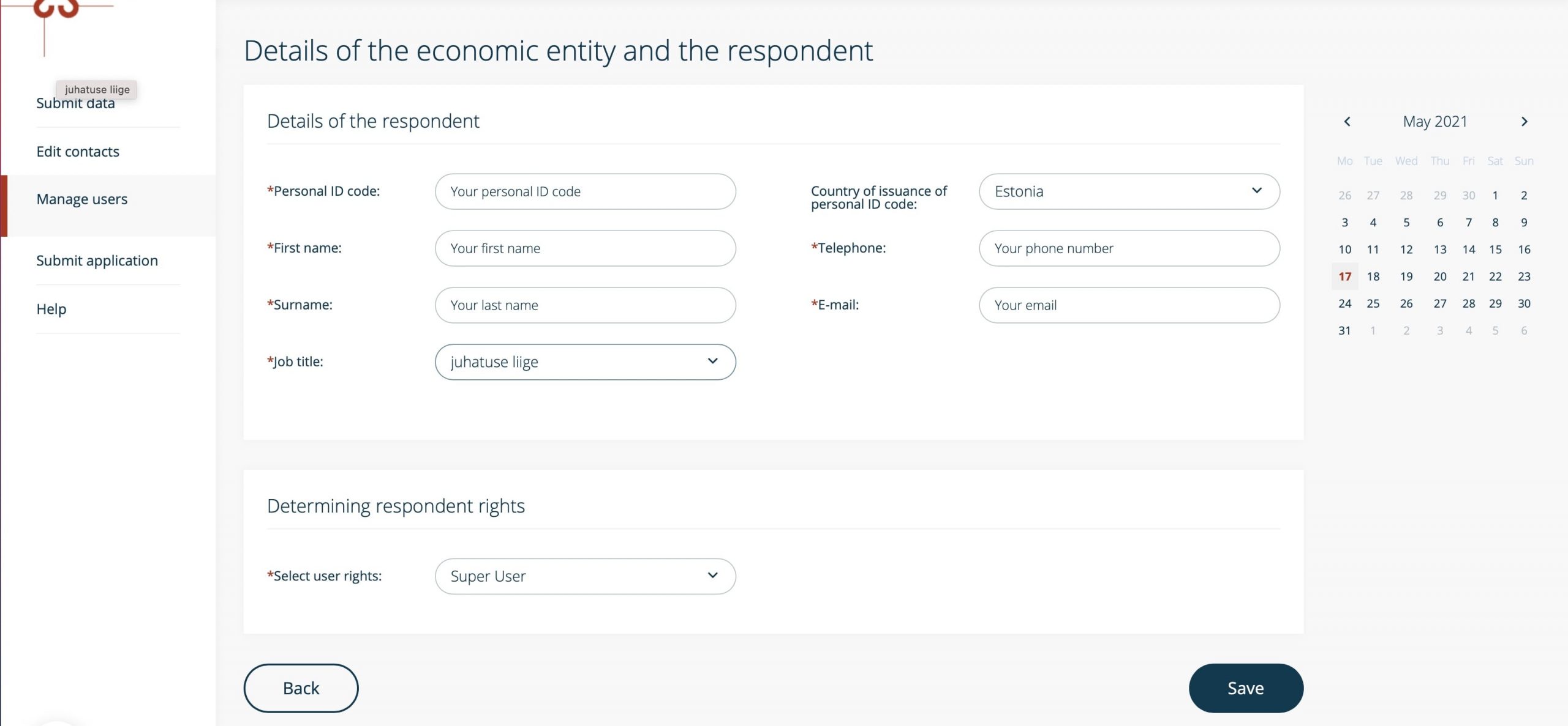 Now you just need to add your data as shown in the picture below and choose “Juhatuse Liige” as “Job title” (which means member of the board). Then, click on “Save”.