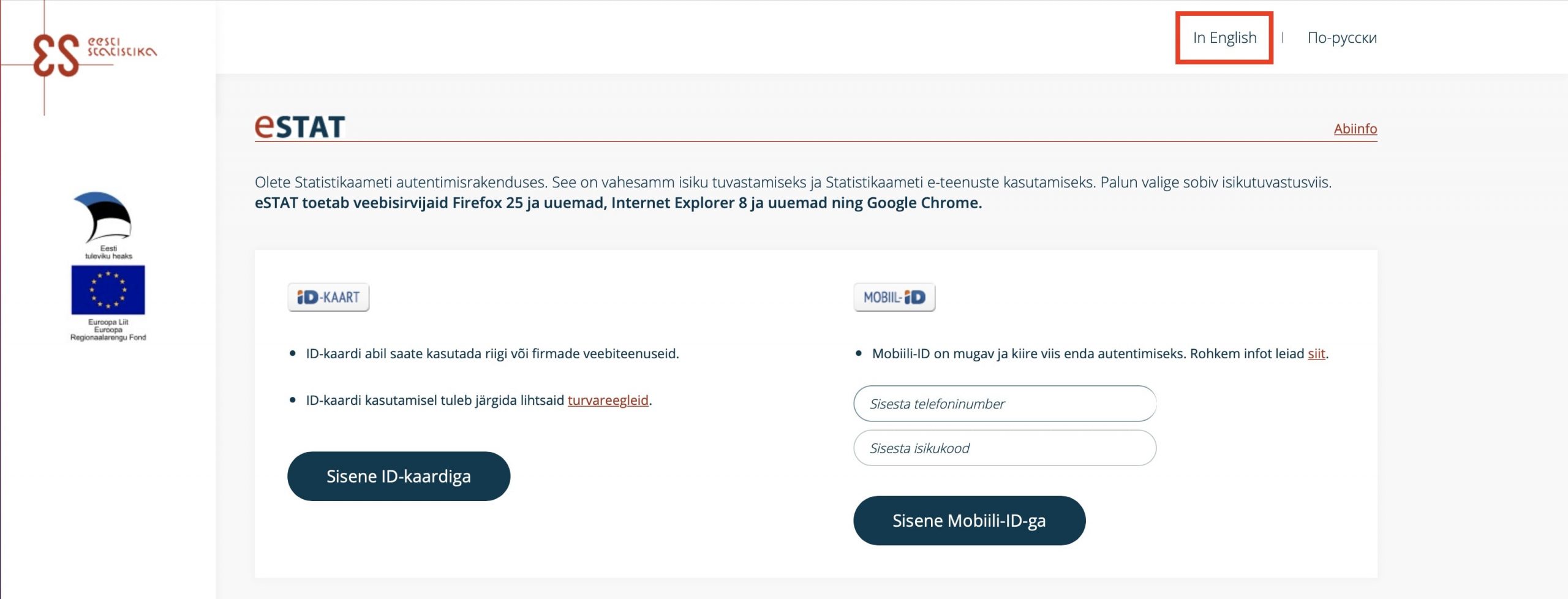 You just have to go to the eStat portal (https://estat.stat.ee/valisportaal/). Once there, select ID-Kaart, “Log in with your ID card”, and enter PIN1.